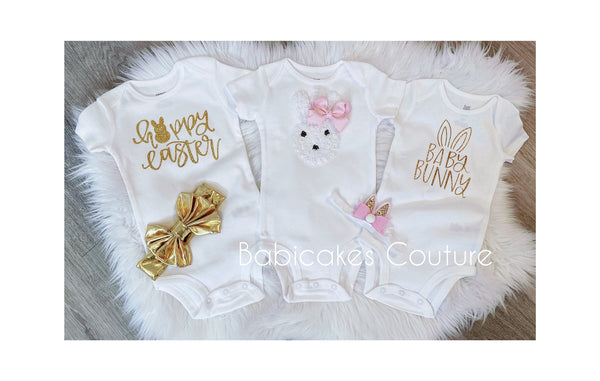 - White Bodysuit: Features gold no-shed glitter "Baby Bunny."