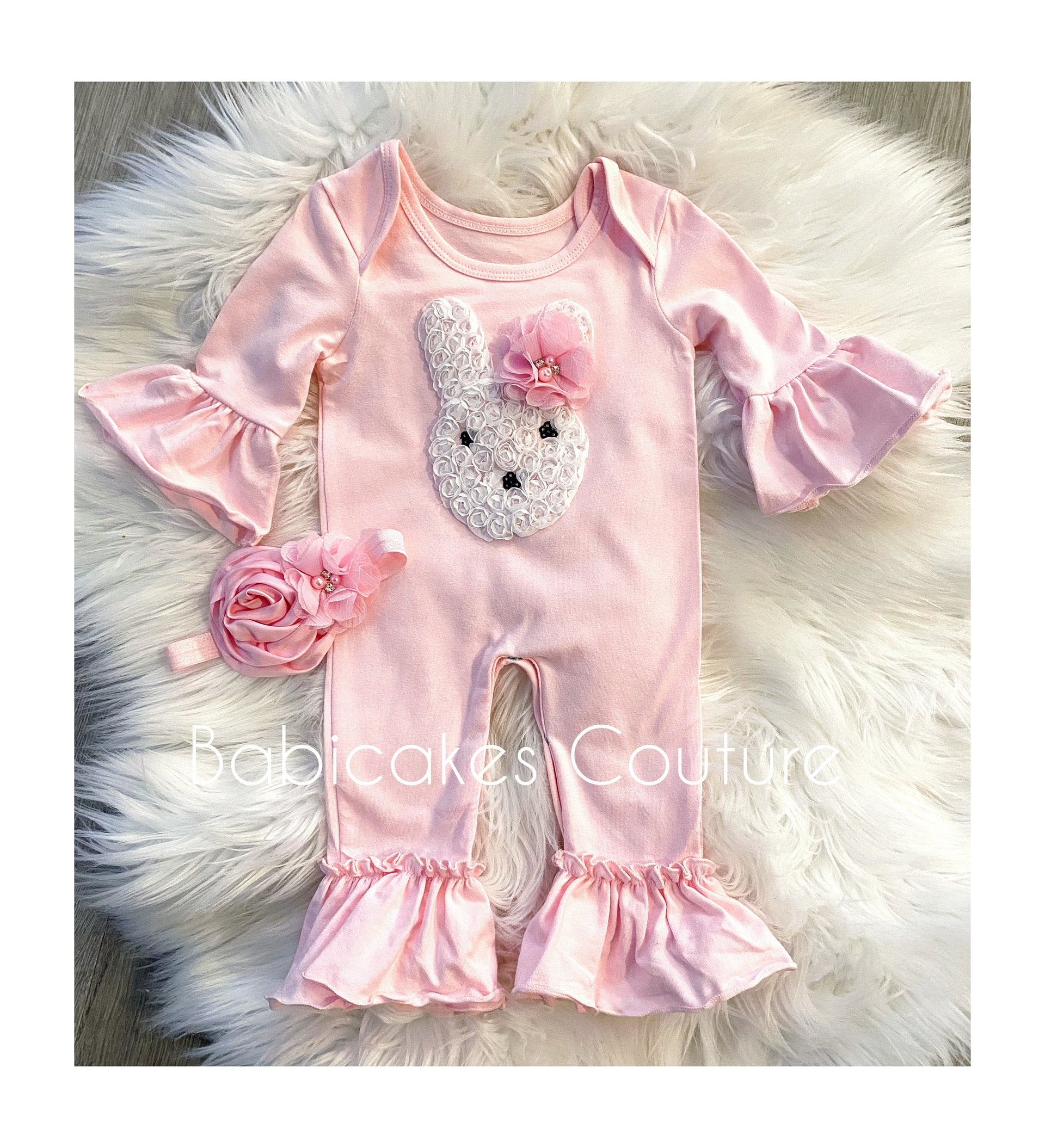 - Ruffle Romper: Pink romper featuring a chiffon bunny adorned with a shabby chic flower. The legs include double ruffles, and a snap-bottom closure ensures easy diaper changes.