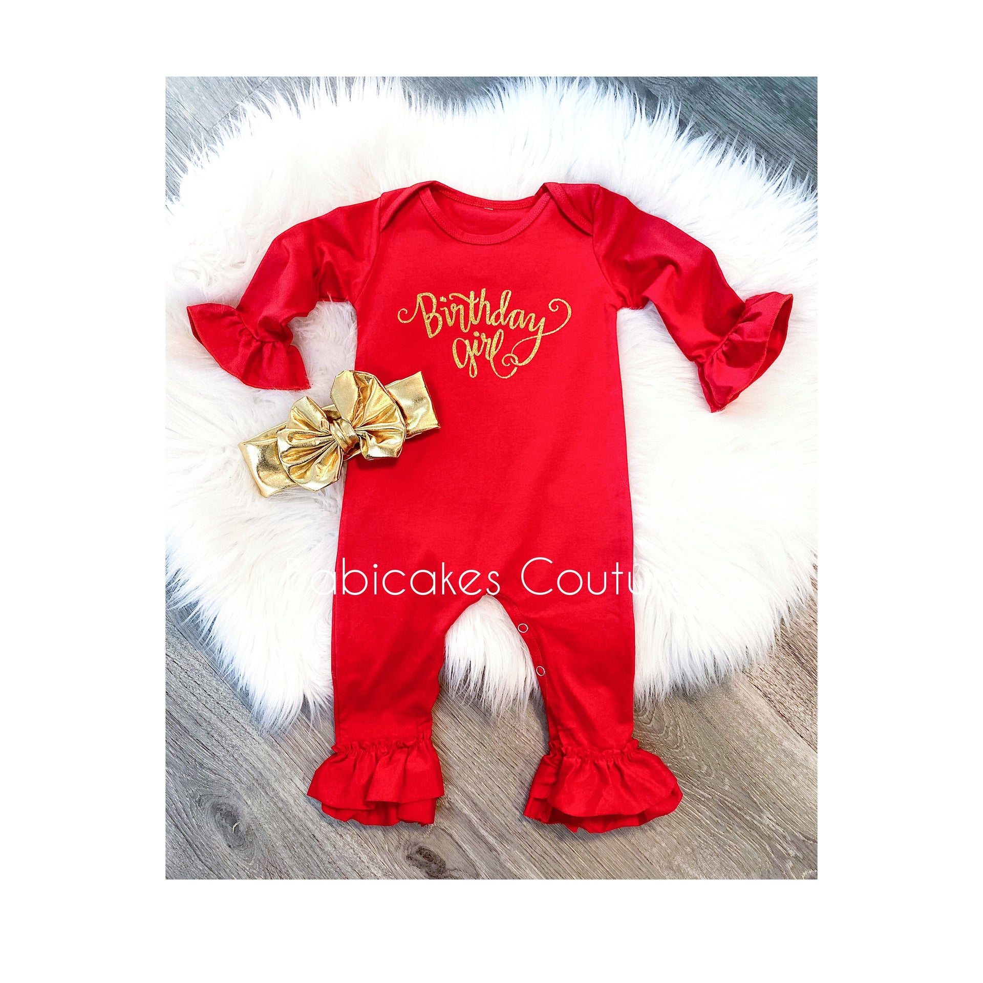 - Ruffle Romper: Red romper featuring ruffled butterfly sleeves and double ruffles on the legs. Includes a snap-bottom closure for easy changing.