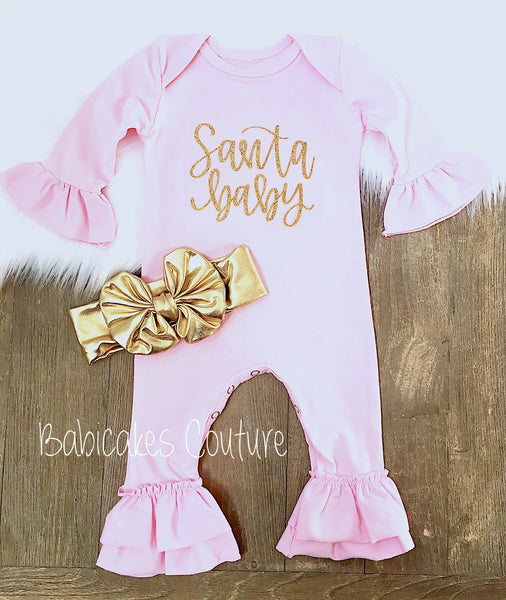 Ruffle Romper: The Pink Ruffle Romper is adorned with sparkly gold no-shed glitter that reads "Santa Baby," making it an eye-catching piece for your holiday festivities. The legs feature double ruffles and a convenient snap bottom for easy diaper changes, ensuring comfort and style.