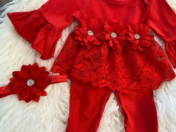 - Ruffle Romper: Red romper featuring a beautiful lace overlay adorned with satin flowers and rhinestone embellishments. The legs have double ruffles and a snap-bottom closure for easy diaper changes.