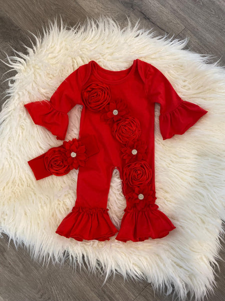 Headband: Accompanying the romper is a Red Headband adorned with Beautiful Shabby Chic satin and chiffon flowers, perfectly complementing the romper's design.