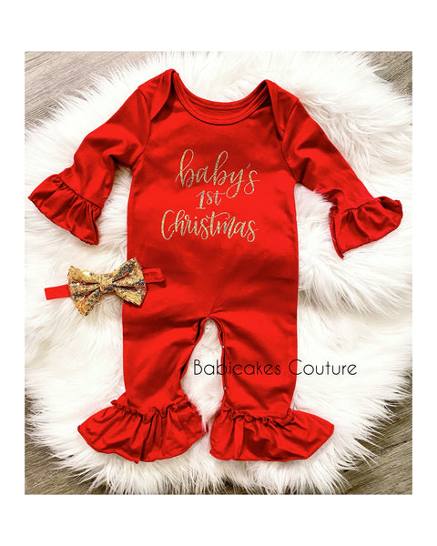 - Ruffle Romper: Red romper featuring a sparkly gold no-shed glitter "Baby's 1st Christmas" design, with ruffles at the wrists and hemline. The legs have double ruffles and a snap-bottom closure for easy diaper changes.