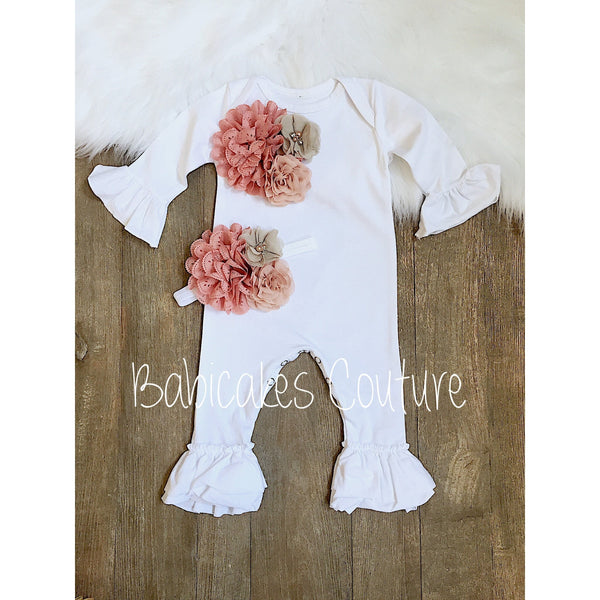 - Ruffle Romper: White romper featuring ruffled sleeves and a beautiful arrangement of luxuriously soft chiffon and satin flowers. Legs have double ruffles and a snap-bottom closure for easy changing.