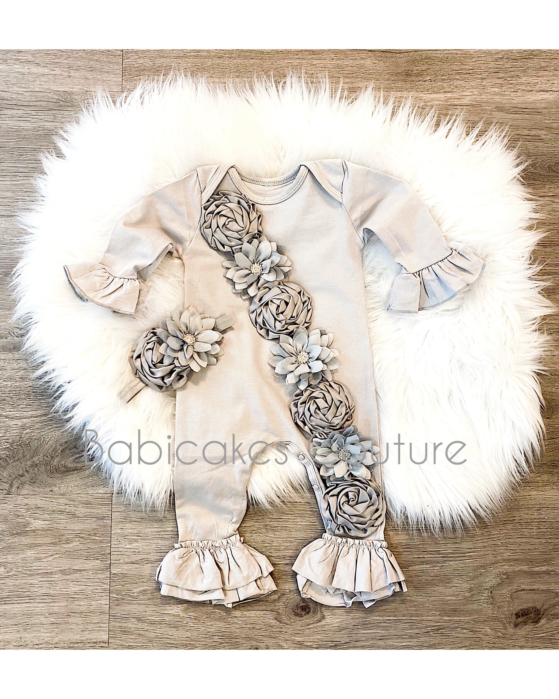 Perfect for baby showers, photoshoots, or any special occasion, the "Gray Ruffle Romper" brings a touch of Hollywood glamour to your little one's wardrobe.