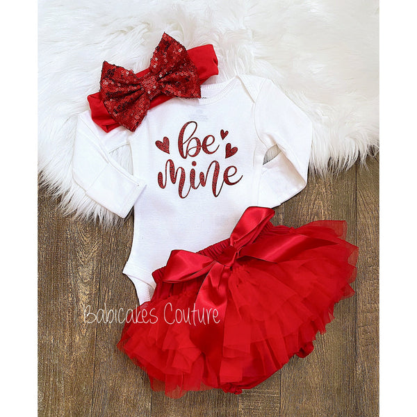- Bodysuit: White bodysuit featuring a red glitter "Be Mine" design with red glitter hearts. Includes a snap-bottom closure for easy changing.