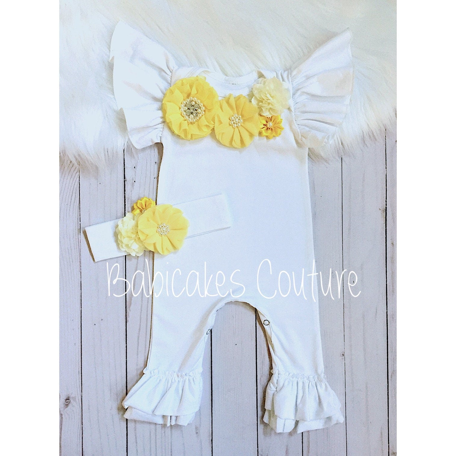 { Ruffle Romper } White Ruffle Romper features butterfly sleeves, adorned with Beautiful Shabby Chic satin and chiffon flowers Legs feature double ruffles with snap bottom for easy changing.