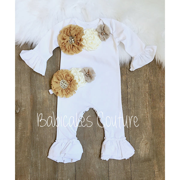 - Ruffle Romper: White romper featuring ruffled sleeves, beautifully adorned with a luxuriously soft arrangement of chiffon and satin flowers. The legs include double ruffles for added charm, with a convenient snap-bottom closure for easy changing.