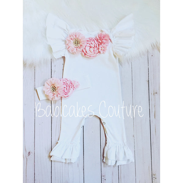 - Ruffle Romper: White romper featuring butterfly sleeves, adorned with delicate Shabby Chic satin and chiffon flowers. The legs feature double ruffles for extra flair, and a snap-bottom closure ensures easy changing.