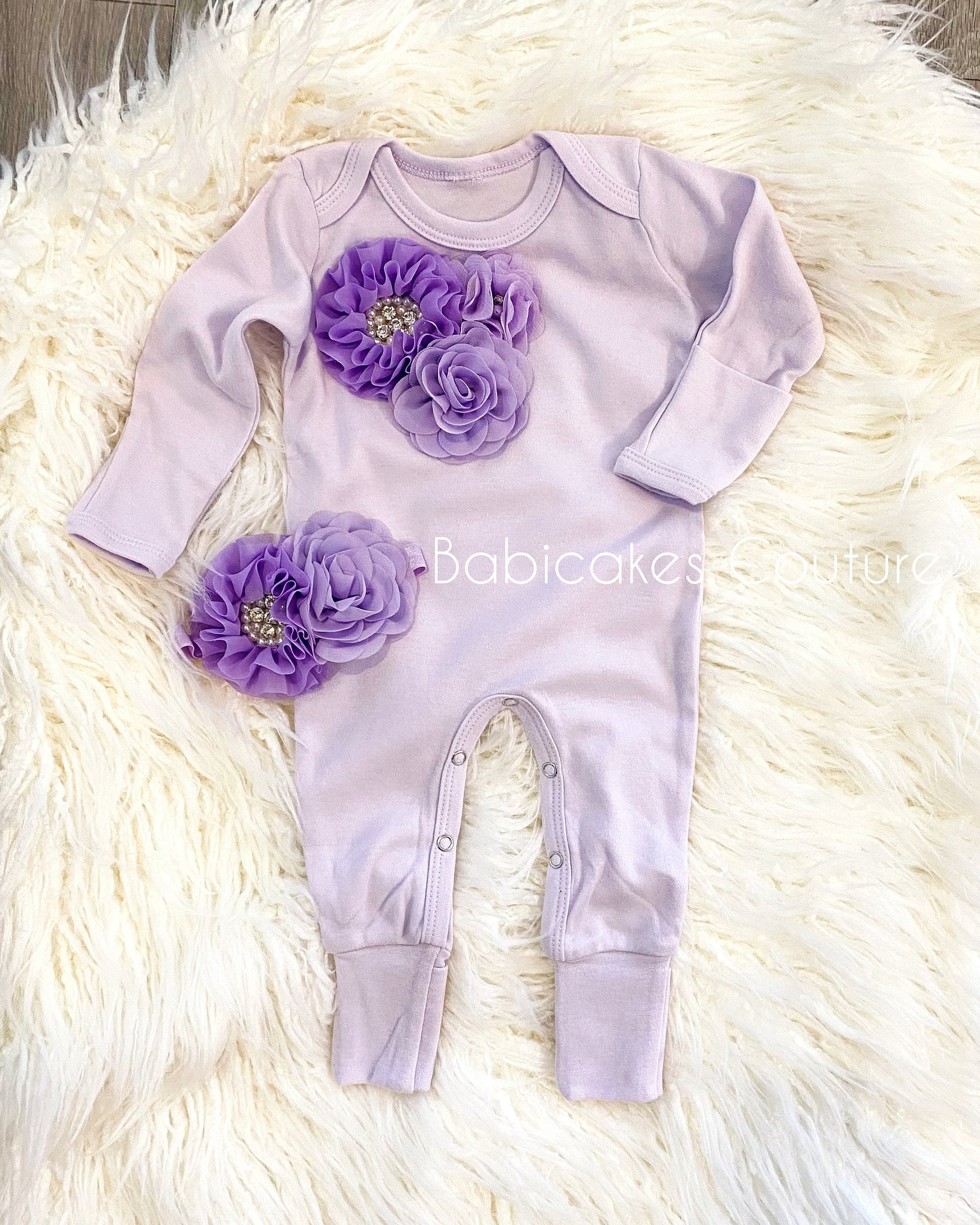 Lavender Romper with Chiffon Flower Accents – Babicakes Couture Exclusive
