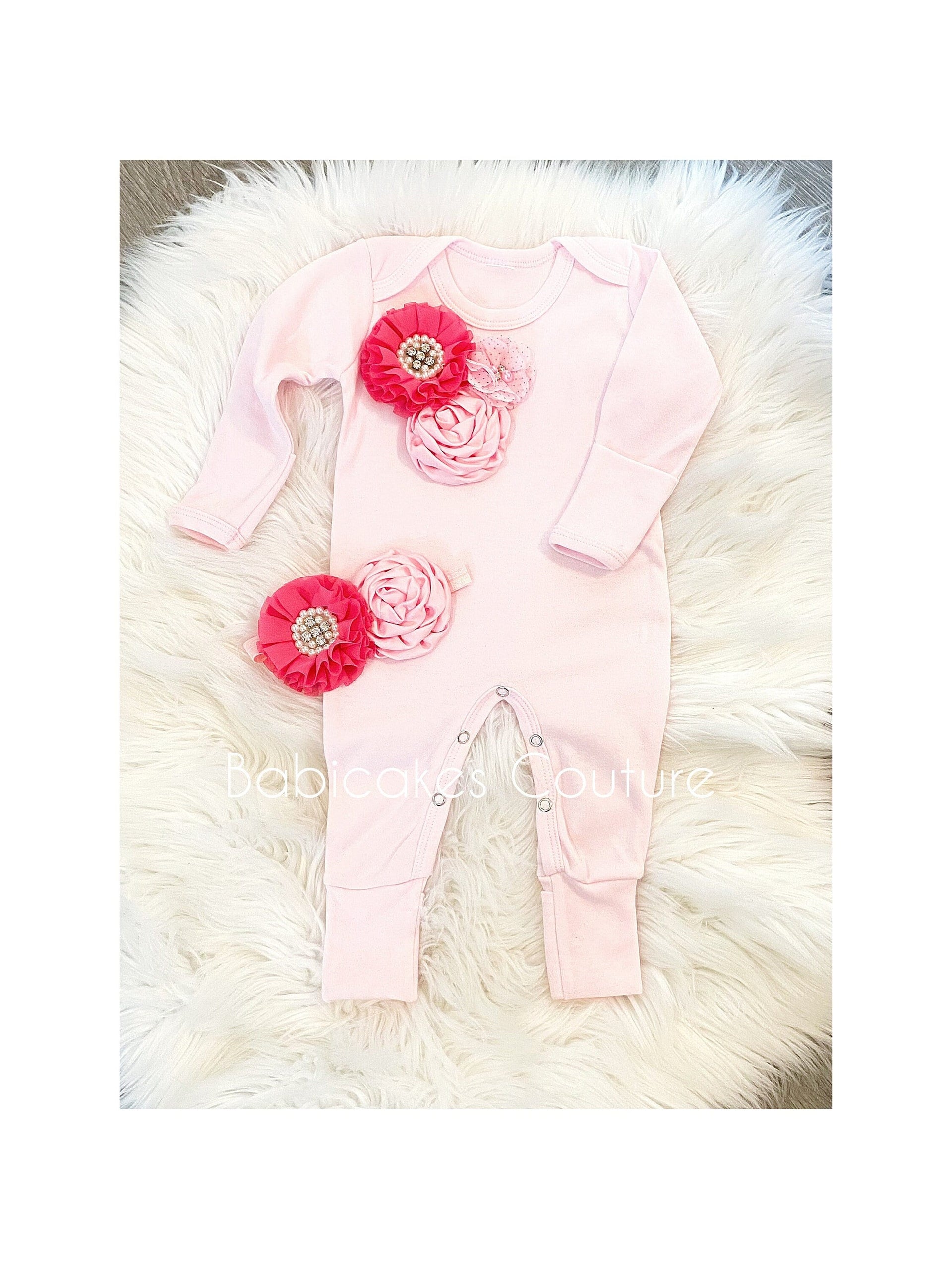 Pink Romper Set with Chiffon and Satin Flowers – Babicakes Couture