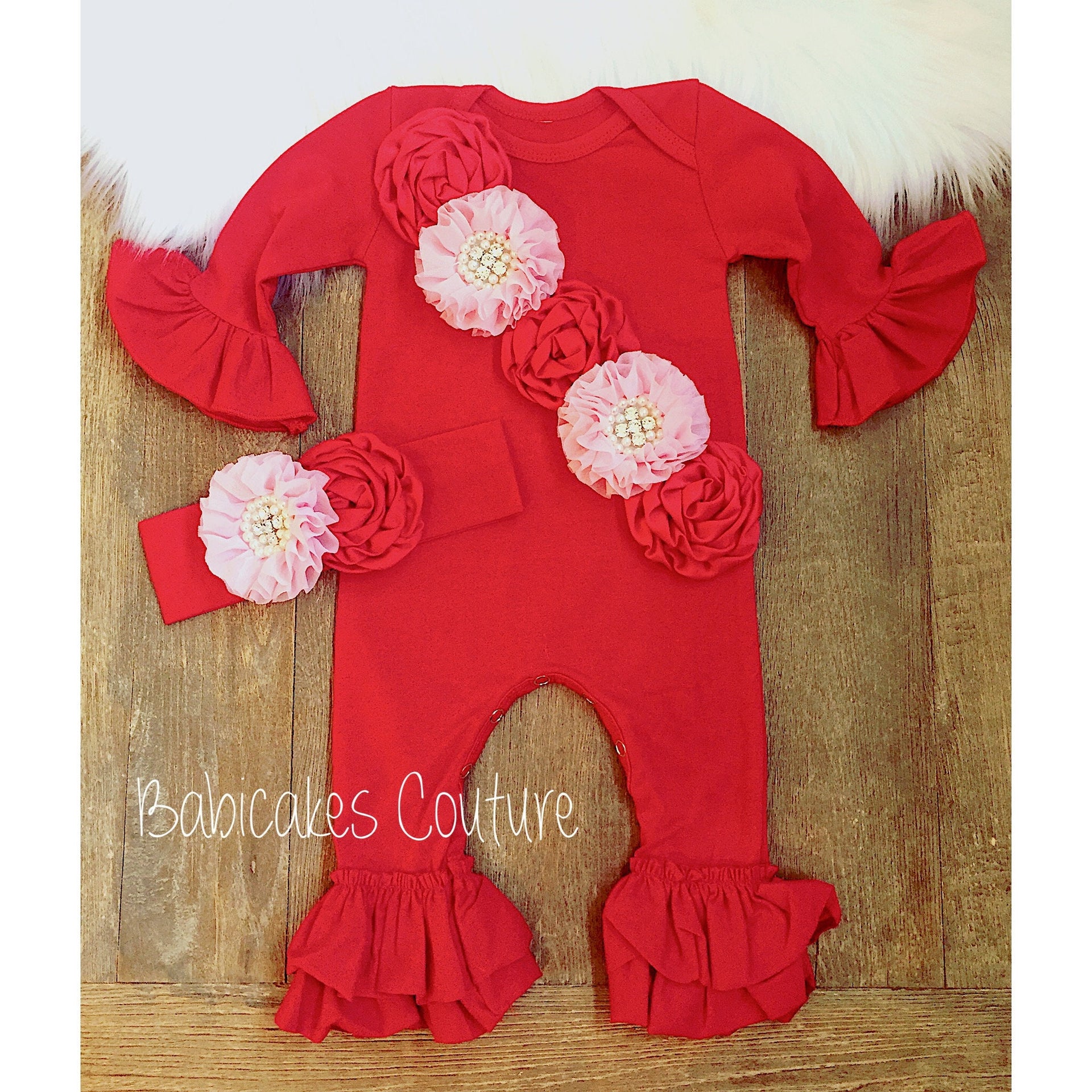 The red ruffle romper is a standout piece, beautifully adorned with chiffon and satin flowers enhanced with rhinestones and pearls. The double ruffle detailing on the sleeves and legs adds an extra touch of elegance, while the snap closure at the bottom ensures easy diaper changes and a comfortable fit for your little one.