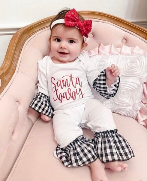 Make this holiday season unforgettable with our charming Santa Baby Ruffle Romper, designed to keep your little one stylish and comfortable during all festive occasions!