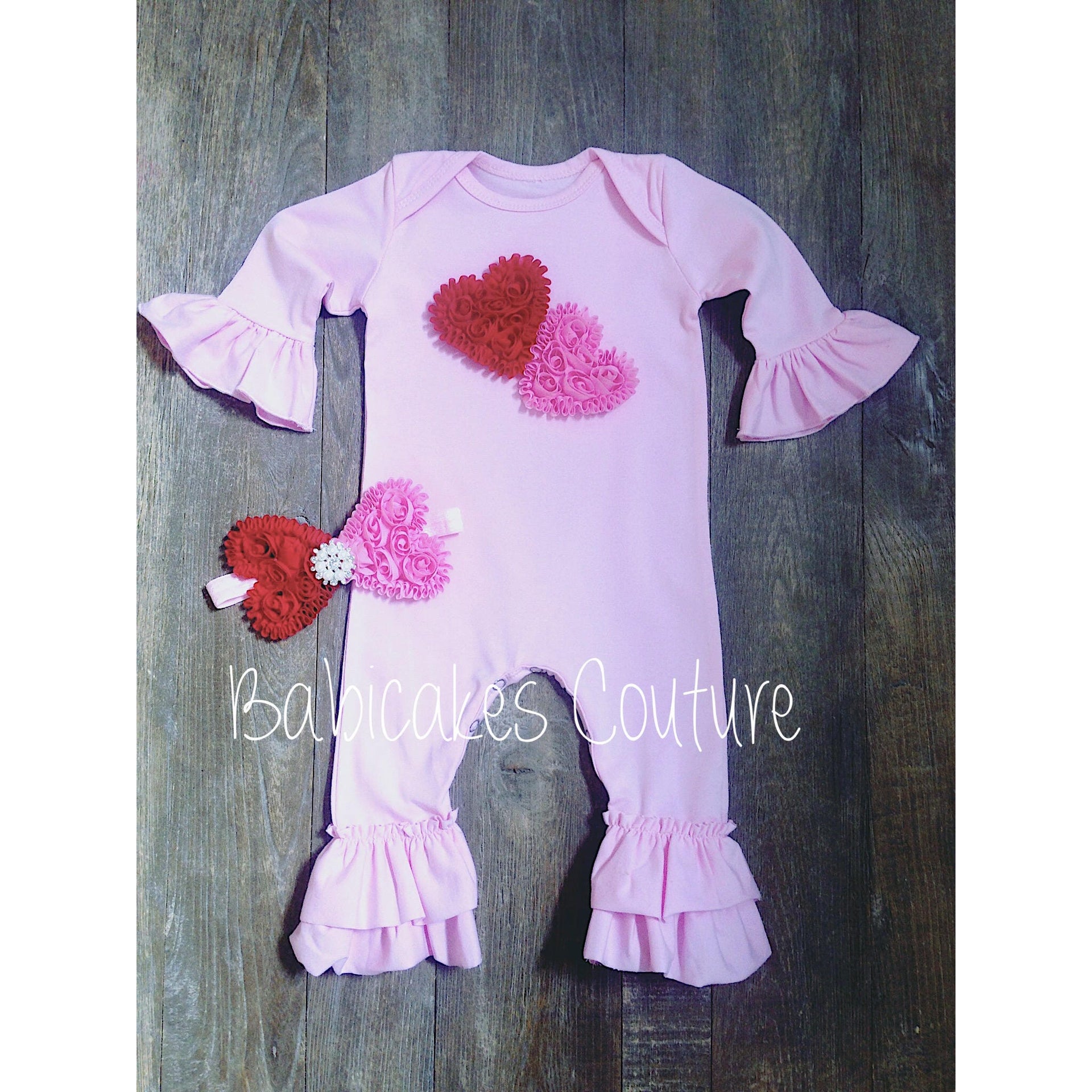 Headband: Complementing the romper is a Pink Stretch Satin Headband. It features matching Pink and Red Shabby Chic Chiffon Hearts, adorned with sparkling pearl and rhinestone embellishments, adding a touch of elegance to your baby's outfit.