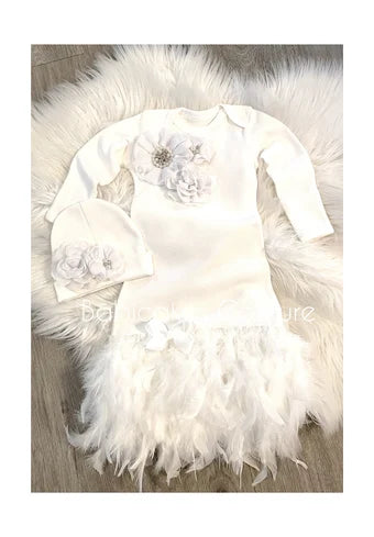 { Gown } 100% Cotton White Layette gown adorned with a delicate soft bouquet of flowers on bodice. Luxurious quality feathers at hemline.