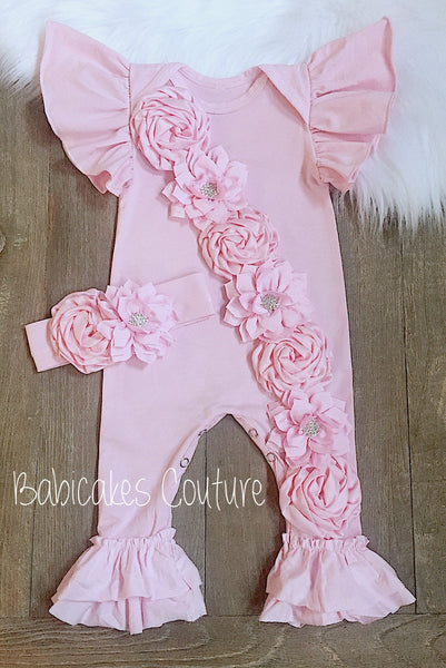 - Ruffle Romper: Adorned with beautiful pink satin rosettes and lotus flowers embellished with rhinestones. The romper features double ruffles on the legs and a convenient snap-bottom closure for easy changing.