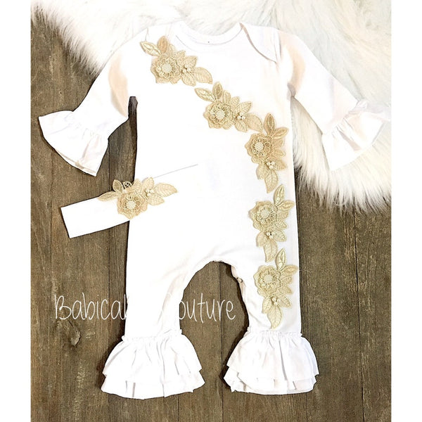 Elevate your little one's wardrobe with our exquisite White Floral Embroidered Ruffle Romper, designed for style and comfort. This stunning outfit is perfect for special occasions, family gatherings, or as a beautiful coming-home ensemble.