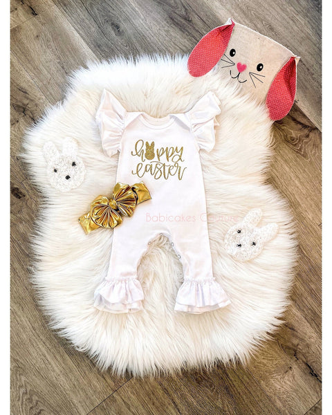 - Ruffle Romper: White ruffle romper featuring our gold glitter no-shed "Happy Easter" design. The romper has double ruffles on the legs and a snap-bottom closure for easy changing. The photo shows the short sleeve style.