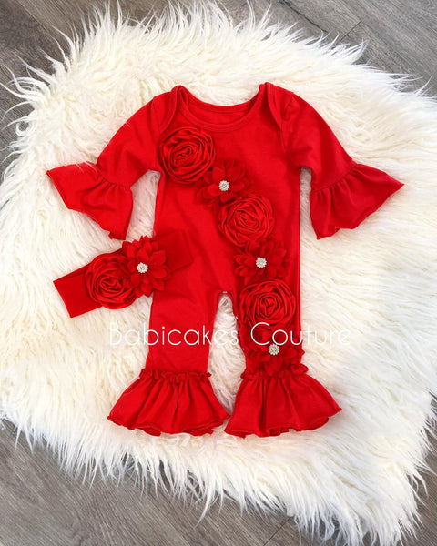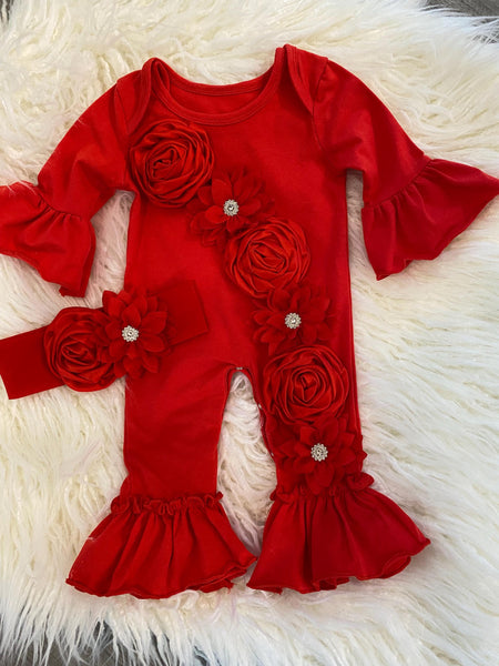 - Ruffle Romper: Adorned with beautiful red satin rosettes and lotus flowers embellished with rhinestones, this romper features double ruffles on the legs and a snap-bottom closure for easy diaper changes.