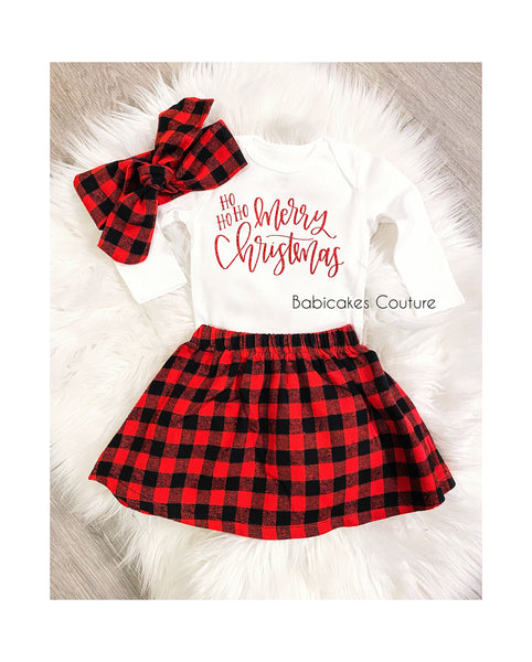Babicakes Couture Holiday Collection – "Ho Ho Ho Merry Christmas" Bodysuit & Buffalo Plaid Skirt Set