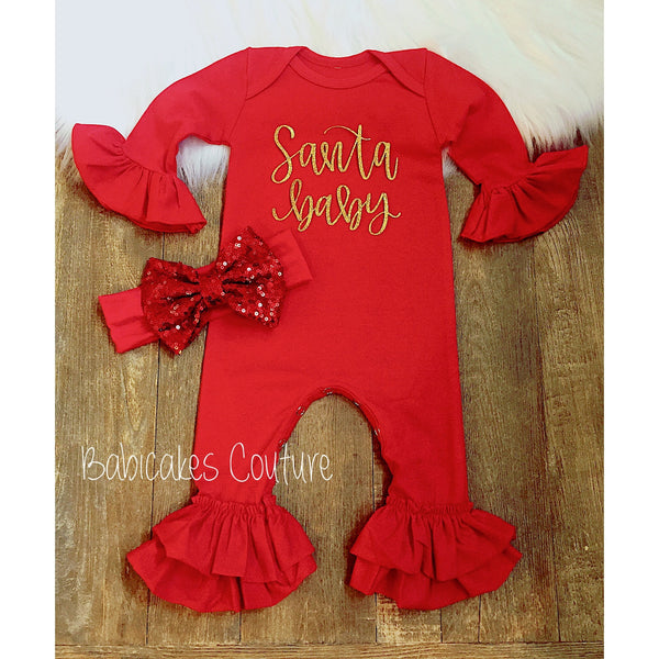 - Ruffle Romper: Red romper with a sparkly gold no-shed glitter "Santa Baby" design. Features double ruffles on the legs and a snap-bottom closure for easy diaper changes.